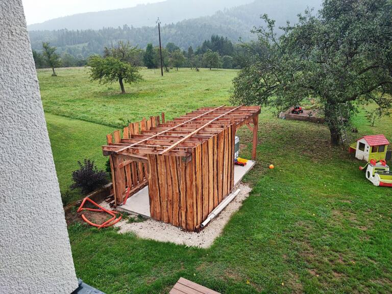 Nos scieurs professionnels se sont rendus sur place afin de prendre les bonnes mesures et découper des planches qui s’incorporent parfaitement avec le carport en place. Ils ont opté pour du bois Douglas de section 9.00 x 5.00 m, qui comble toutes les attentes du propriétaire. Façonnées avec amour au sein de notre scierie, les planches ont ensuite été montées sur le carport au domicile du propriétaire.
